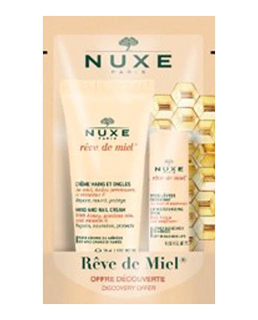 La crema de manos y uñas Rêve de Miel® es una fórmula sedosa y no grasa que, gracias a su contenido de miel, girasol, aceites preciosos y vitamina E, nutre y ayuda a reparar las manos secas. Además, protege las manos del envejecimiento prematuro y contribuye a suavizar las manos y reforzar las uñas, día tras día. Formato: 30 ml. El stick de labios hidratante Rêve de Miel® presenta un práctico formato que calma y suaviza los labios dañados o secos en cualquier momento del día, despidiéndose así de los labios secos y agrietados. Formato: 4 g.